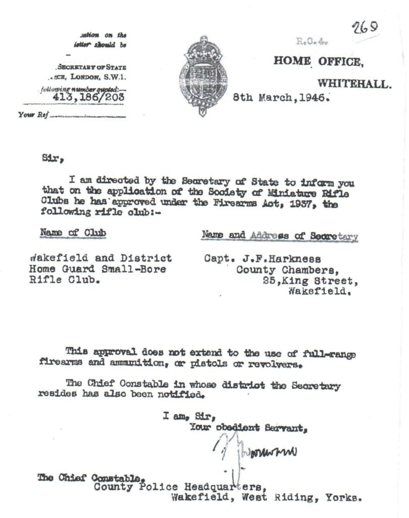 The existence of Wakefield Rifle and Pistol Club goes back to 1946 with the first record of WRPC at the Home Office dated to March 1946.