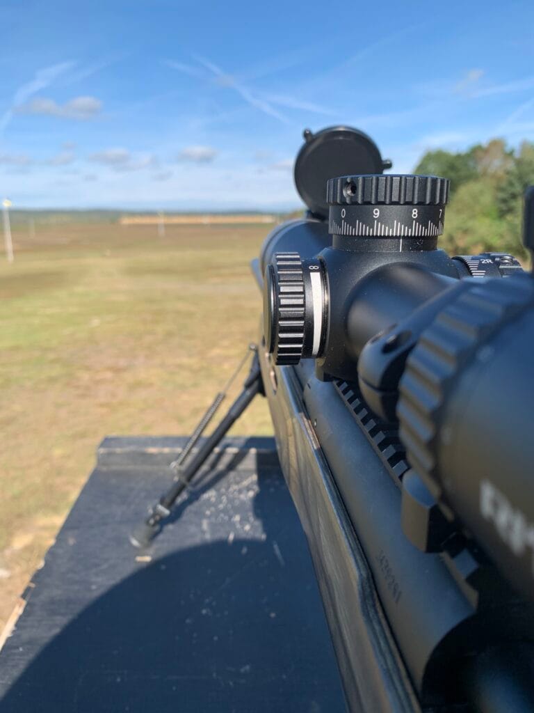 View of scope turrets while pointing at the 1000 yard targets at Bisley