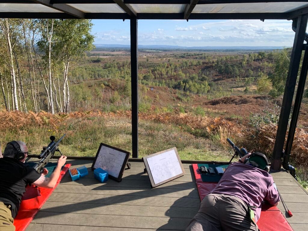 Two WRPC members rifle shooting on the Chobham range at Bisley. The steel targets are too small to see without a scope.